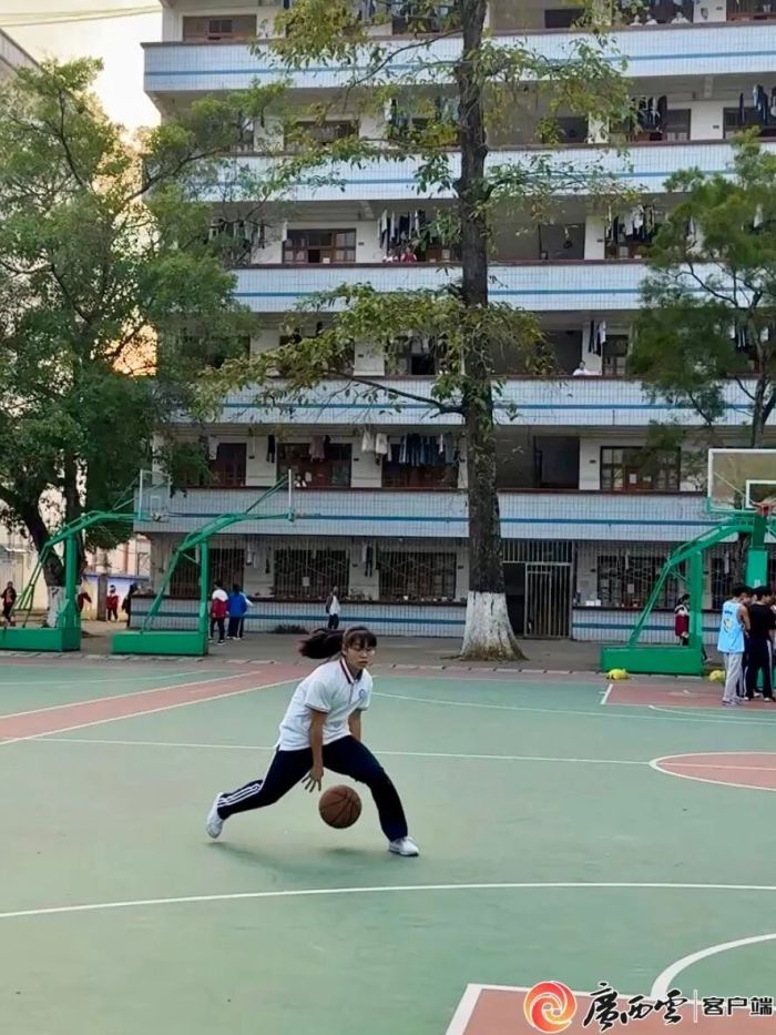 近日,一段视频在网络上迅速走红:画面中,来自广西崇左市龙州县的冯敏敏身穿校服、戴着眼镜,在篮球场上面对两名高出她一头的男生的左右夹击,她连续变向运球摆脱防守,迅速带球突向篮下。当两名男生在篮下同时跃起封堵时,她腾空而起,凭借出色的滞空能力躲过封盖,以一记高难度动作将球抛进篮筐。