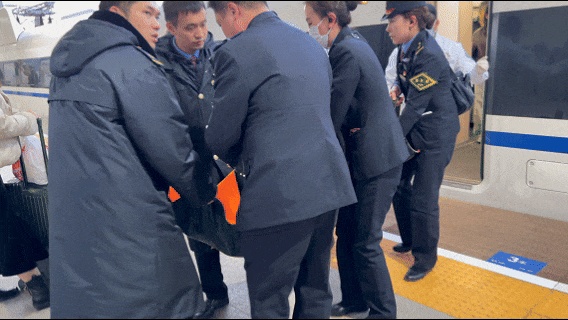 17时46分,黄江峰引导120急救医护人员提前抵达站台。4分钟后,列车准点进站,早已就绪的工作人员立刻上前,护送旅客下车。