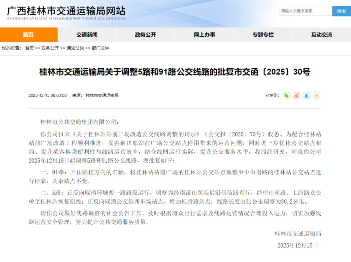 你公司报来《关于桂林站站前广场改造公交线路调整的请示》(公交报〔2025〕75号)收悉。为配合桂林站站前广场改造工程顺利推进,妥善解决原站前广场公交站点停用带来的运营问题,同时进一步优化公交站点布局、提升乘客换乘便利性与线路运营效率,结合线网运行实际,提升公交服务水平,我局经研究,同意你公司2025年12月19日起调整5路和91路公交线路,现批复如下: