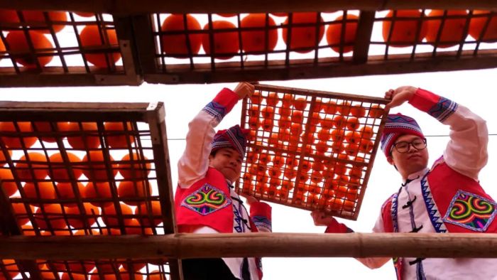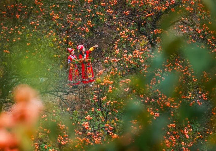 身着民族服饰的游客攀上树梢体验月柿采摘乐趣。 杨宗盛 摄
