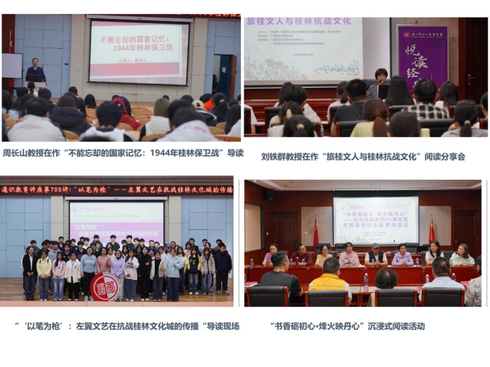 图书馆系统挖掘馆藏抗战文献、手稿、图片等珍贵资源,推出“不朽的印记——文献中的抗战”“红星闪耀照南国——八路军桂林办事处与抗日战争”等5期主题展览,展出史料近160幅。依托“名师—馆员—读者”三联荐书机制,精心筛选并推荐红色经典书目505种,让沉睡的文献转化为生动的育人教材。展览累计为校内32个党团支部、班级及社团提供专题讲解,吸引参观师生近5000人次,实现了历史资料从静态陈列向动态叙事的跨越。