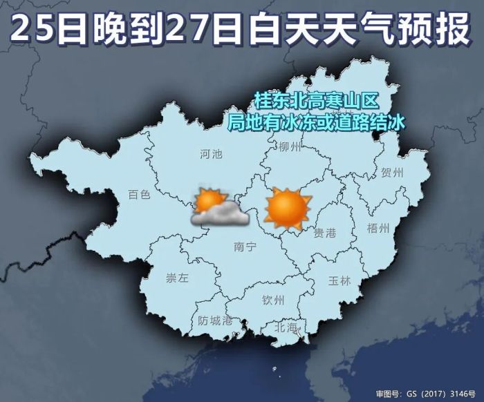 25日晚上到27日白天,干冷气团彻底占据上风,广西天空打开天气转好。