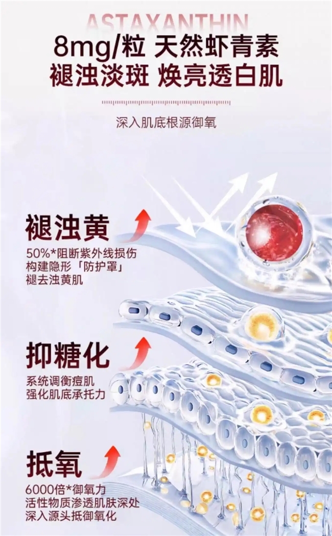 最打动人心的无疑是配方表上的精细构造。虾青素两粒含量8mg,源自雨生红球藻,握有狙击自由基的王牌能力。日常补充,被称为“天然抵氧因子”。它的御氧效率,是维生素C的6000倍,超越维生素E的1000倍,让辅酶Q10的表现也逊色至少800倍。高浓度设计远胜同类型胶囊,1粒就能顶3粒,整体防护力突破预期。除此之外,加入了30mg酵母提取物(含50%谷胱甘肽),谷胱甘肽是公认的体内抗氧化核心,主控代谢过程。35mg维生素E作为经典防护明星,直接切断自由基链反应;5mg冰白番茄提取物则细水长流地优化肤色光泽。20mg橄榄提取物补充健康活性因子,助力全面提升。而压轴的130mg卵磷脂把神经系统和肝脏健康双管齐下,所有成分各司其职、精准分工。养护不是堆料,每种原材都用数据说话。