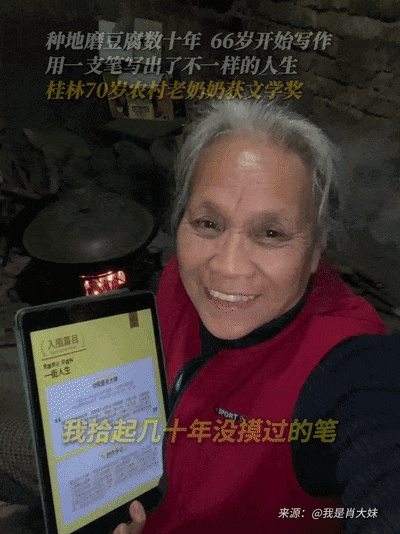 桂林70岁的农村老奶奶凭一支素笔斩获文学奖项她说:“就算是一棵歪脖子树,也能开出花来。” 她用躬身力行的热爱与坚持印证了梦想从无年龄界限