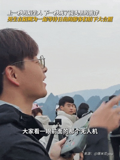 上一秒的陌生人,下一秒的同框旅伴在桂林阳朔男生为并肩等待日出的游人拍下大合照那一刻,我们都是彼此温暖的见证者