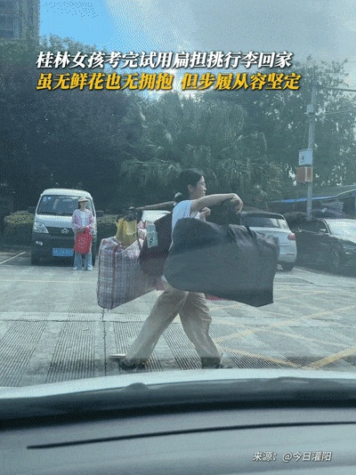 桂林女孩刘燕考完试用扁担挑行李回家