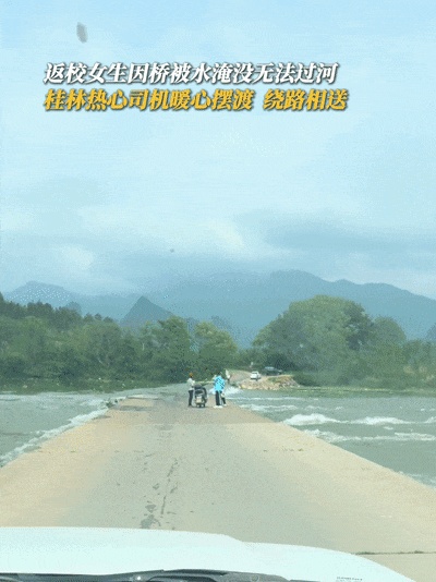 返校女生遇桥面被水淹没,无法过河前行桂林热心司机见状停车将女孩们捎渡过桥还特意多绕了一段路将两名女生安全送到公交站面对赞扬,他朴实说道:“没有想那么多,能帮就帮。”