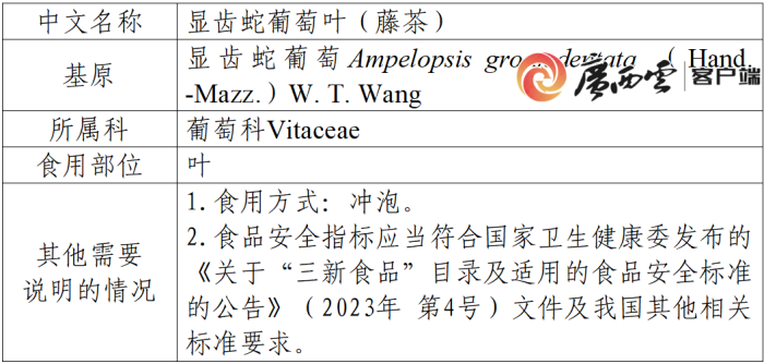 符合纳入目录条件情况:显齿蛇葡萄叶(藤茶)在广西具有30年以上食用历史,食品安全指标应当符合国家卫生健康委发布的《关于“三新食品”目录及适用的食品安全标准的公告》(2023年 第4号)文件及我国其他相关标准要求。其收载于《广西壮族自治区瑶药材质量标准》第二卷(DYB45-GXYYC0149-2021),且未列入《中国药典》,产品符合中药材资源保护、野生动植物保护、生态保护等相关法律法规规定。