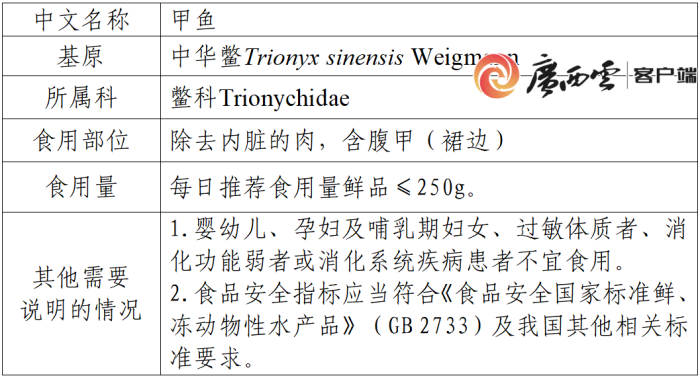 符合纳入目录条件情况:中华鳖在广西具有30年以上食用历史,食品安全指标应当符合《食品安全国家标准 鲜、冻动物性水产品》(GB 2733)等标准的要求,收载于《广西中药材标准》第二册且未列入《中国药典》,人工养殖产品符合中药材资源保护、野生动植物保护、生态保护等相关法律法规规定。