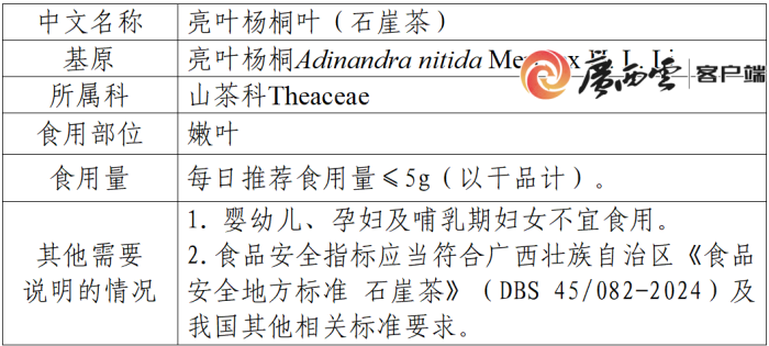 符合纳入目录条件情况:亮叶杨桐叶(石崖茶)在广西具有30年以上食用历史,食品安全指标应当符合广西壮族自治区《食品安全地方标准 石崖茶》(DBS 45/082)。其收载于《广西壮族自治区壮药质量标准》第二卷(DYB45-GXZYC0052-2011),且未列入《中国药典》,人工种植产品符合中药材资源保护、野生动植物保护、生态保护等相关法律法规规定。
