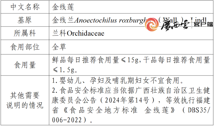 符合纳入目录条件情况:金线莲在广西具有30年以上食用历史。依据广西壮族自治区卫生健康委员会公告(2024年第14号),食品安全指标等效执行福建省《食品安全地方标准 金线莲》(DBS35/006-2022)。其收载于《广西壮族自治区壮药质量标准》第三卷(DYB45-GXZYC0171-2017),人工种植产品符合中药材资源保护、野生动植物保护、生态保护等相关法律法规规定。