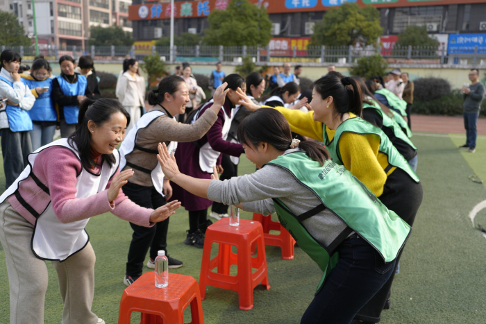 本次趣味运动会紧扣“团队协作”核心,设置了“抢瓶子”“众星捧月”“绣球投框”“智传呼啦圈”“旱地龙舟”“蒙眼抢水果”等多项兼具趣味性与挑战性的集体项目。这些项目并非单纯比拼个人反应速度与实操技巧,而是将团队默契配合程度与协作精神作为核心考察点。赛场上,平日里站在三尺讲台教书育人的老师们,化身活力迸发的参赛选手,为了团队荣誉并肩作战。大家齐心协力、默契配合,在一个个趣味项目中挥洒汗水、释放活力,现场掌声、笑声、加油声此起彼伏,热闹非凡。