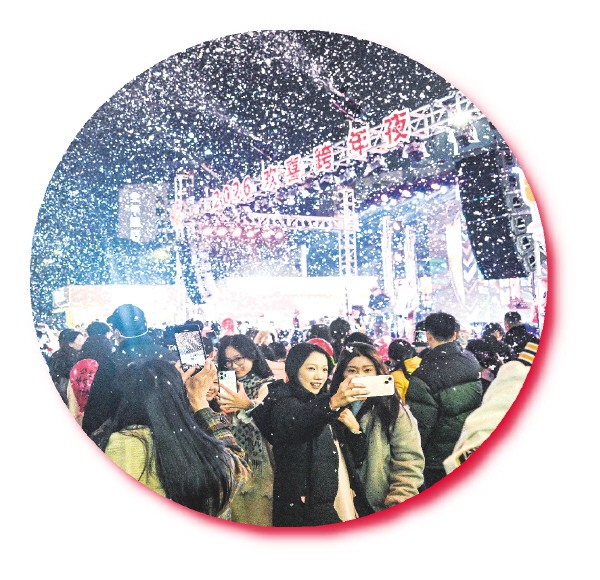 昨晚,在客世界广场,漫天飞舞的“雪花”为市民们带来了一场难忘的跨年夜。记者滕嘉 摄