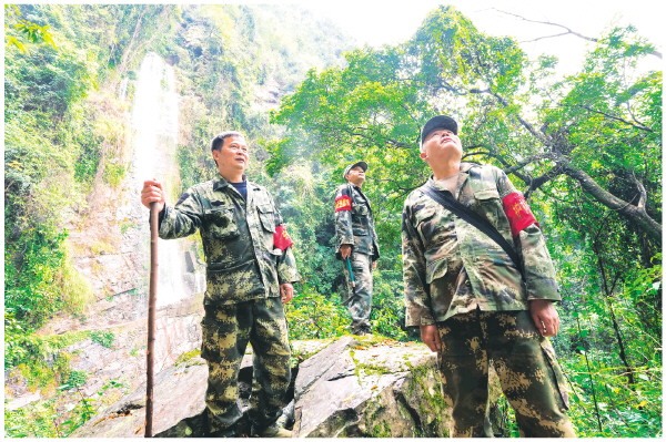 广西狮子山国家森林公园的护林员正在巡护,在他们背后就是牛奶崖瀑布。