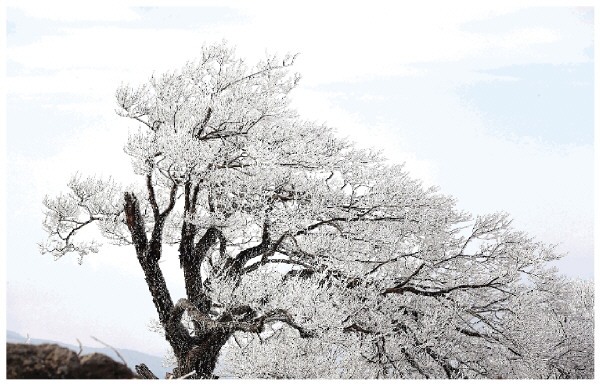 树上挂满雾凇。