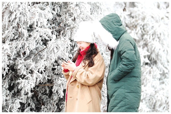 游客与雾凇合影。