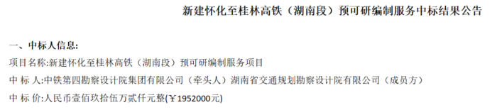 公告显示,中标单位为中铁第四勘察设计院集团有限公司(牵头人)湖南省交通规划勘察设计院有限公司(成员方),中标价是195.2万元。