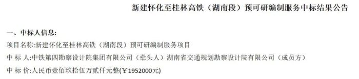 1月6日,湖南轨道集团招采平台发布了《新建怀化至桂林高铁(湖南段)预可研编制服务中标结果公告》 。