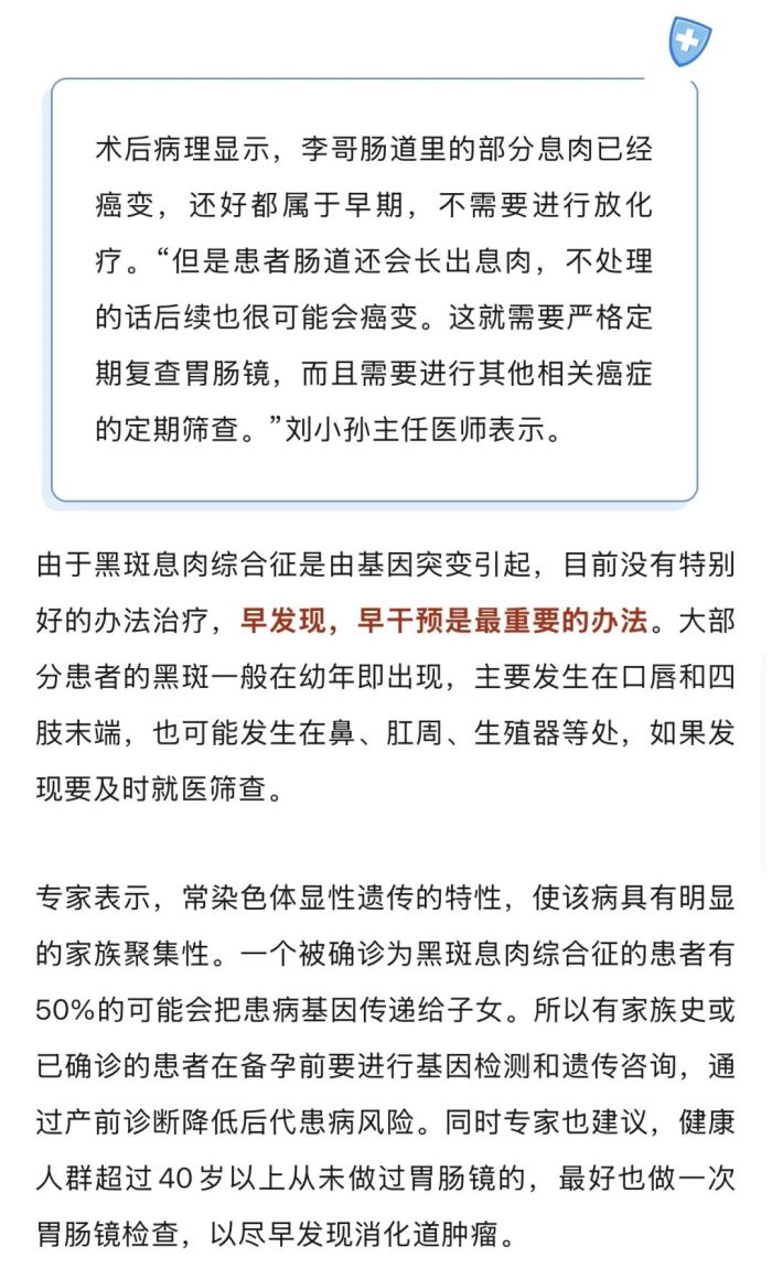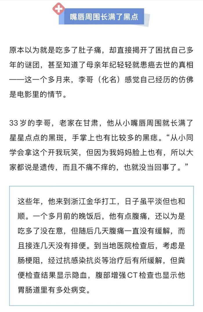 看着眼前的李哥,浙大一院胃肠外科副主任刘小孙主任医师很快就想到了一种可能——他嘴唇附近有黑斑,手掌上也有不少黑色素沉积,再加上胃肠道里多发息肉,大概率是一种叫做“黑斑息肉综合征(Peutz-Jeghers syndrome, PJS)”的罕见病。