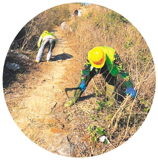 “挖的时候小心点,注意保护石板!”1月8日上午,冬日暖阳洒在侯山隧道旁的山谷间,中筑六建(安阳)建设有限公司桂林分公司(以下简称“中筑六建桂林分公司”)的施工队员们正忙碌着。他们有的小心翼翼铲去石板上厚厚的覆土,一块块古石板逐渐显露,虽青苔斑驳、划痕累累,但仍能看出当年的整齐模样;有的手持镰刀,清理古道旁杂生的草木,既防止植物根系撬松石块,也为古道“腾”出通行空间;还有工人沿路巡查,记录需要重点修补的破损处。这是记者在侯山背古道修复现场看到的景象。