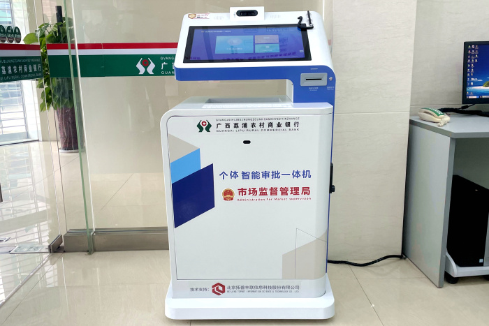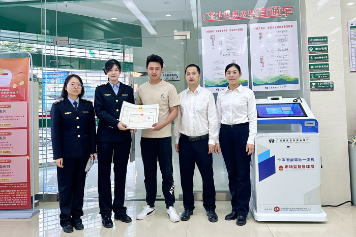 作为荔浦市首家“个体工商户、私营企业主题银行”,滨江支行始终坚守“个私银行育苗扶壮”服务理念,将政银合作优势转化为服务实效。支行创新引入个体智能审批一体机,实现营业执照登记注册“零人工”自助办理,经营者仅凭身份证即可完成“实名认证、信息填报、电子签名、执照领取”全流程,最快5分钟内就能拿到营业执照,同步办理银行账户开立业务,真正实现“个体注册+金融服务”一站式服务,彻底解决经营者“多头跑、办事慢”的痛点。针对个体工商户和私营企业融资需求,支行量身定制信贷产品,优化审批流程,以精准金融活水助力本土商户、企业纾困发展,赢得市场广泛认可。
