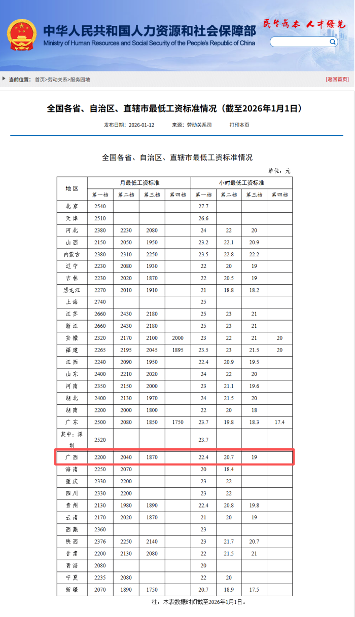 1月12日,中华人民共和国人力资源和社会保障部官网公布全国各省、自治区、直辖市最低工资标准情况(截至2026年1月1日)。