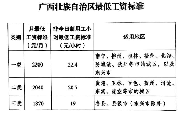 日前,自治区政府发布关于调整全区最低工资标准的通知。通知指出,根据《中华人民共和国劳动法》和《最低工资规定》有关要求,结合广西实际,决定对全区最低工资标准进行调整,调整后的全区最低工资标准自2025年7月1日起执行。