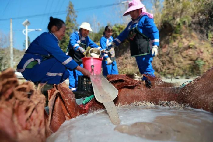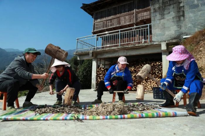 村民在吊脚楼旁铺上尼龙膜,用木槌捶碎蕨根。“邻里之间常互相帮忙,这捶打的声音,成了苗寨冬日里熟悉的节奏。”赶来协助捶打蕨根的村民苏良二说道。互助的传统,早已融入这项古老技艺中。