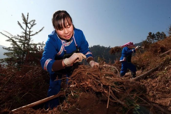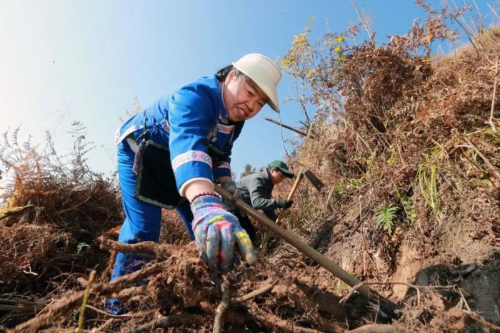 “挖蕨根,要找到蕨生长茂密的地方,锄头要挖得深,越往下的根粉量越高。冬季正是挖蕨根的好时候。”村民潘新连一边挥动锄头挖蕨根,一边对记者说。记者看到,刚挖出的蕨根沾着泥土湿气,透着大自然特有的清新气息。