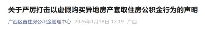 1月18日,广西区直住房公积金管理中心发布《关于严厉打击以虚假购买异地房产套取住房公积金行为的声明》,全文如下: