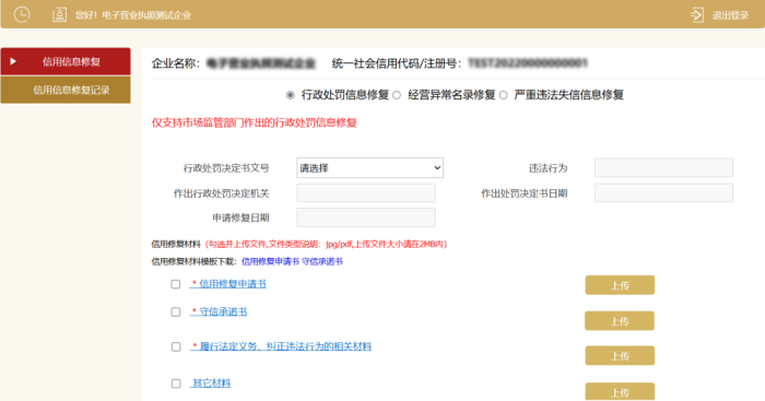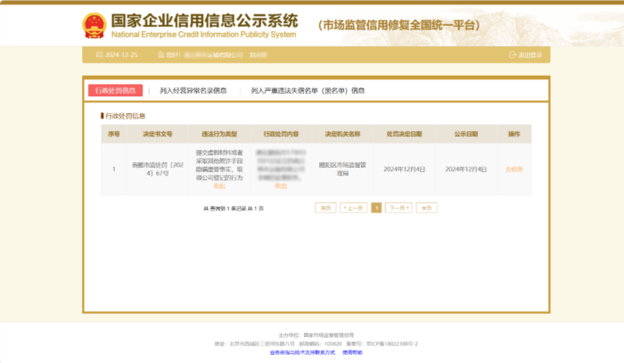 登录后查看可修复的违法失信信息,包括行政处罚信息、经营异常名录信息、严重违法失信名单信息。
