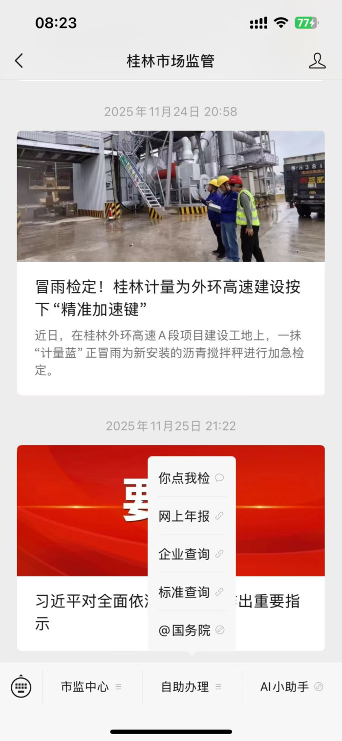 微信搜索“桂林市场监管”公众号,关注后点击“私信”,如下图所示:
