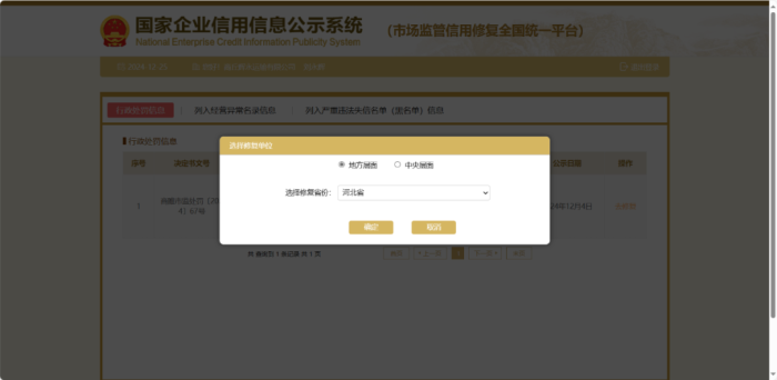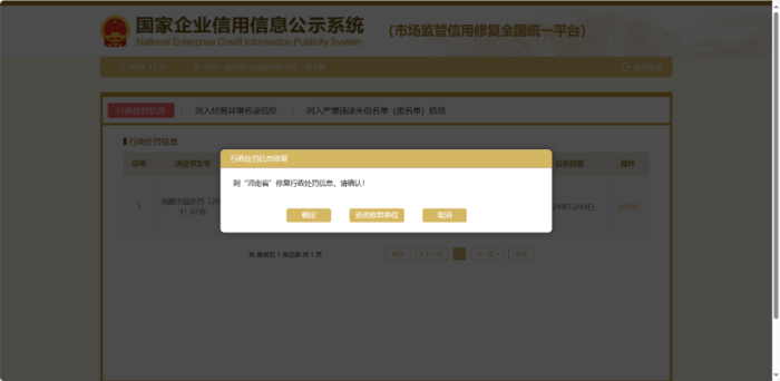 点击“去修复”,即可到该违法失信信息决定机关所在省份的信用修复系统,开展信用修复。如“去修复”推荐的决定机关所在省份不正确,也可更改修复单位。