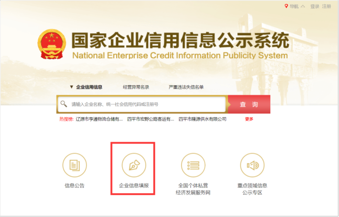 进入国家企业信用信息公示系统(http://www.gsxt.gov.cn),点击“企业信息填报”。
