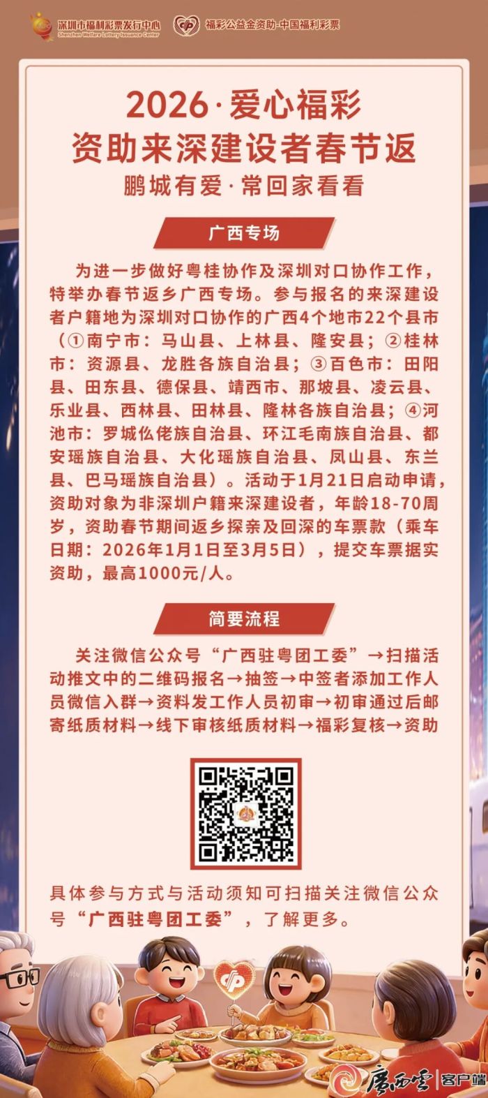 据悉,广西专项活动由自治区政府驻广州办事处具体负责,广西驻粤团工委组织实施,广西专项活动在微信公众号“广西驻粤团工委”发布并报名。报名时间为1月21日0时至1月23日24时,资助对象为年龄在18至70周岁之间的广西22个县市的来深建设者。可资助的车票乘车日期为1月1日至3月5日,交通工具包括长途汽车、火车(含动车),受助者提交车票据实资助(实报实销,最高可获1000元资助)。报名者可带1名不超过14周岁的儿童,乘车产生的成人票或儿童票可一同资助,儿童需提供相关身份证明资料。