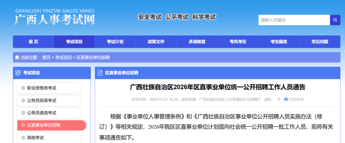 1月21日,广西人事考试网发布《广西壮族自治区2026年区直事业单位统一公开招聘工作人员通告》。2026年1月26日8:00至1月30日18:00期间,报考人员可登录广西人事考试网报名。笔试将于3月28日及29日两日举行。