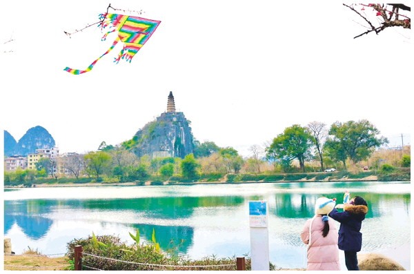 1月22日下午,穿山公园迎来了冬日里难得的暖阳。两名市民在塔山前、碧水旁放起了风筝,色彩艳丽的风筝与桂林山水相映成趣,构成了一幅和谐美丽的画卷。