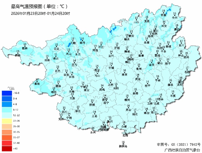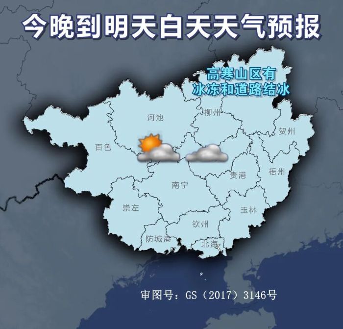 今天(23日)晚上到明天(24日)白天,全区多云到阴天,高寒山区有冰冻和道路结冰。最低气温:高寒山区-2℃~4℃,桂东北5℃~8℃,其他地区8℃~12℃。