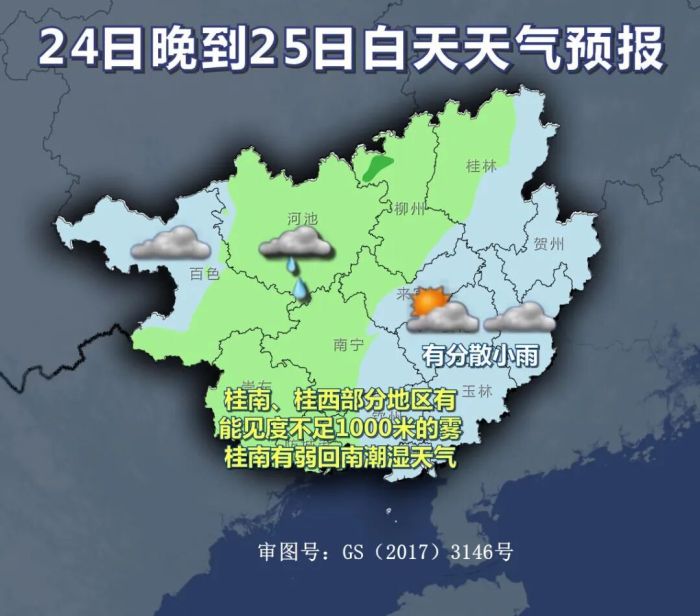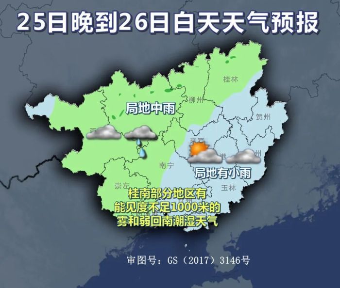 25日晚上到26日白天,桂北、桂西阴天有小雨、局地中雨,其他地区多云到阴、局地有小雨。桂南部分地区有能见度不足1000米的雾和弱回南潮湿天气。最低气温:桂东北5℃~10℃,其他地区10℃~16℃。