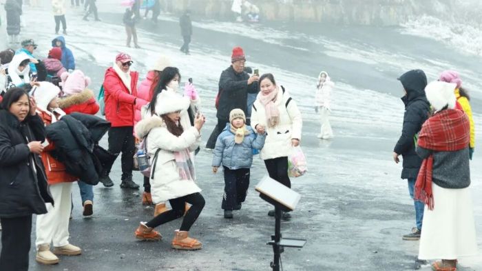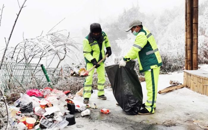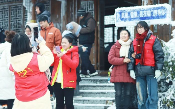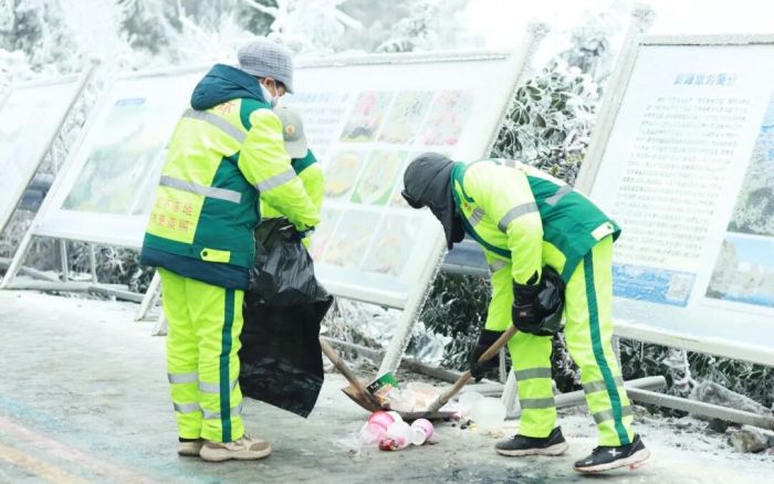 热闹的盛宴背后,是多方力量的暖心守护与周密保障。环卫工人顶着严寒清扫路面积雪与垃圾,守护雪景公园的整洁环境;卫健、应急等部门的工作人员现场待命,随时提供医疗保障与应急支援;志愿者们穿梭在游客中,提供路线指引、防寒提醒、热水补给等服务;主办方则严把食材质量关,统筹协调现场秩序,确保游客吃得放心、玩得舒心;交警部门在结冰路段设岗执勤,通过巡逻管控、引导车辆有序停放、协助安装防滑链等,全方位保障交通通行安全。