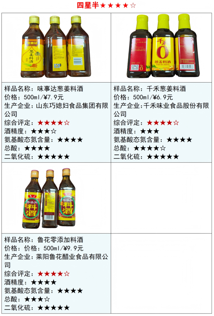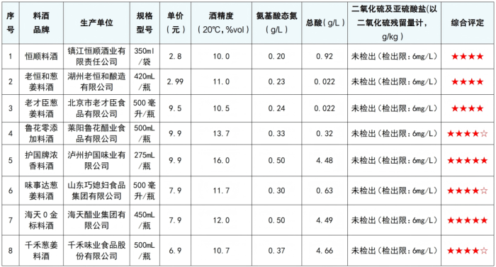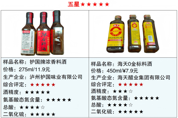 测试结果显示,8款料酒样品中,2款样品表现优秀获五星,3款样品表现较好获四星半,3款样品表现良好获四星。检验结果仅对比较试验购买的样品负责。