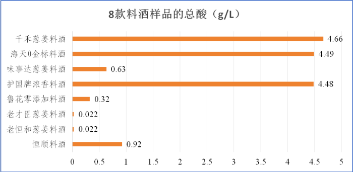 料酒中的总酸能平衡风味、去腥增鲜。适量酸度可软化肉质、促进入味,并在烹调中与腥味物质反应,减轻异味,使口感更清爽。同时,总酸还能抑制微生物生长,起到一定保鲜作用。行业标准SB/T 10416-2007《调味料酒》要求,总酸(以乳酸计)≤5.0g/L,8款料酒样品的总酸测试结果见下图,可以看出所有样品均符合标准要求,但存在一定的差异,总酸的高低对应了不同的口感,不宜简单地以数值的高低作为品质的判断标准,消费者可以根据自己的口味偏好和所烹饪食材的特征选择相应料酒。