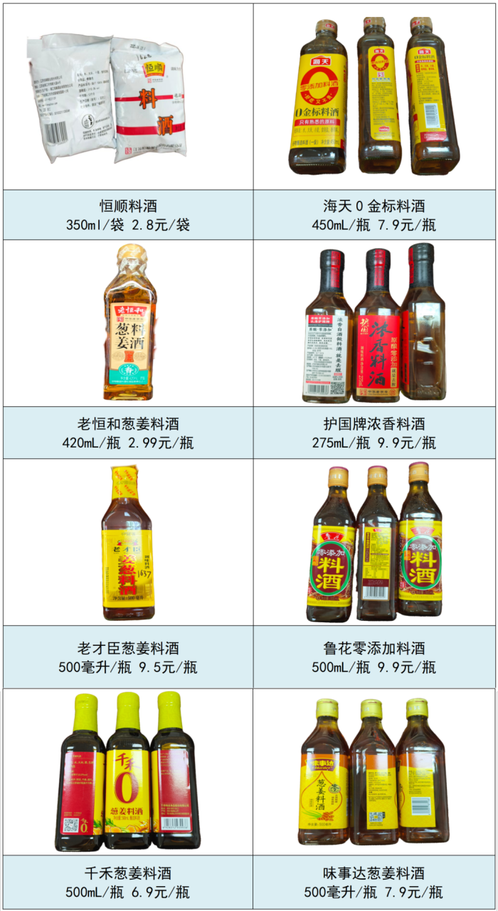 本次比较试验样品由桂林市消费者协会工作人员以普通消费者身份,从桂林市大型商场和超市随机购买,包括护国牌浓香料酒、味事达葱姜料酒、海天O金标料酒、鲁花零添加料酒、千禾葱姜料酒、老才臣葱姜料酒、恒顺料酒、老恒和葱姜料酒等 8款料酒,价格从2.8元至9.9元不等。