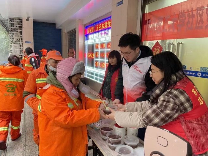 “天气这么冷,快喝碗热粥暖暖身子!”1月26日,理工大学社区党支部携手共建单位的党员志愿者带着热腾腾的腊八粥,走上街头,送到环卫工人手中,为寒冬里坚守岗位的环卫工人送去关怀与敬意。