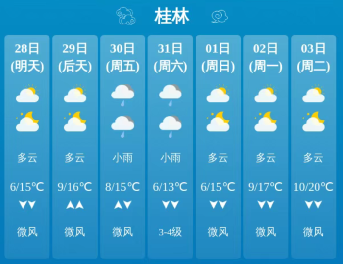 根据最新的气象资料分析,未来十天,桂林或迎接两次降雨过程。其中,1月30-31日受较强冷空气影响,桂林有一次小雨、局部中雨到大雨过程,平均气温下降4-6℃、局地8℃以上,高寒山区局地有冰冻和道路结冰,偏北风3-4级、阵风6-7级。2月5-6日,则还有一次小雨、局部中雨过程。