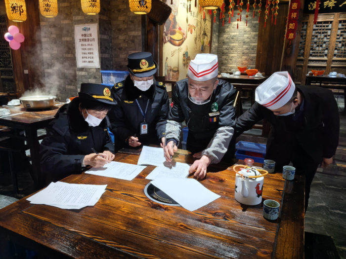 ▲执法人员与经营户签订《承接年夜饭食品安全承诺书》(永福县市场监管局供图)