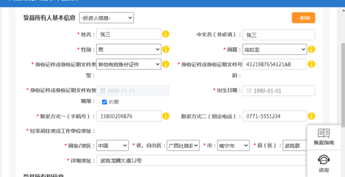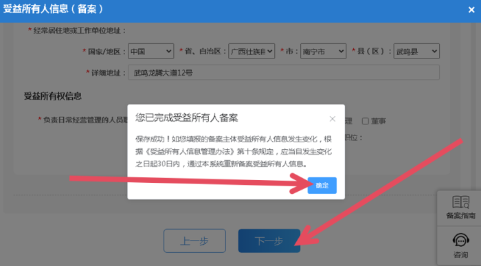 填报所有信息后点击“确定”,即完成受益所有人备案