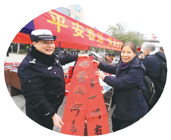 民警为旅客送上对联。 记者陈静 摄