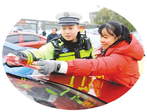 民警和司机一起为汽车贴上“出入平安”的窗花。记者陈静 摄