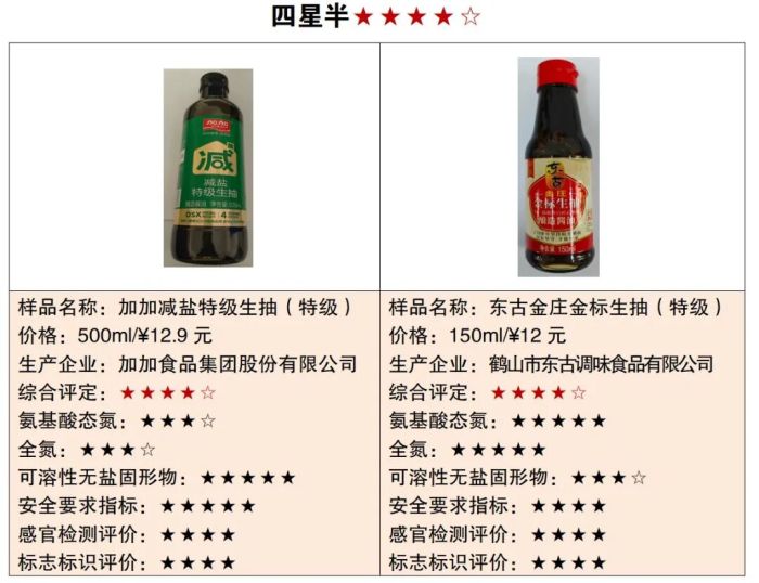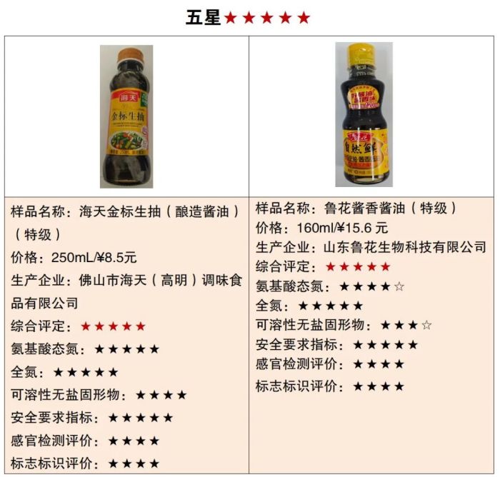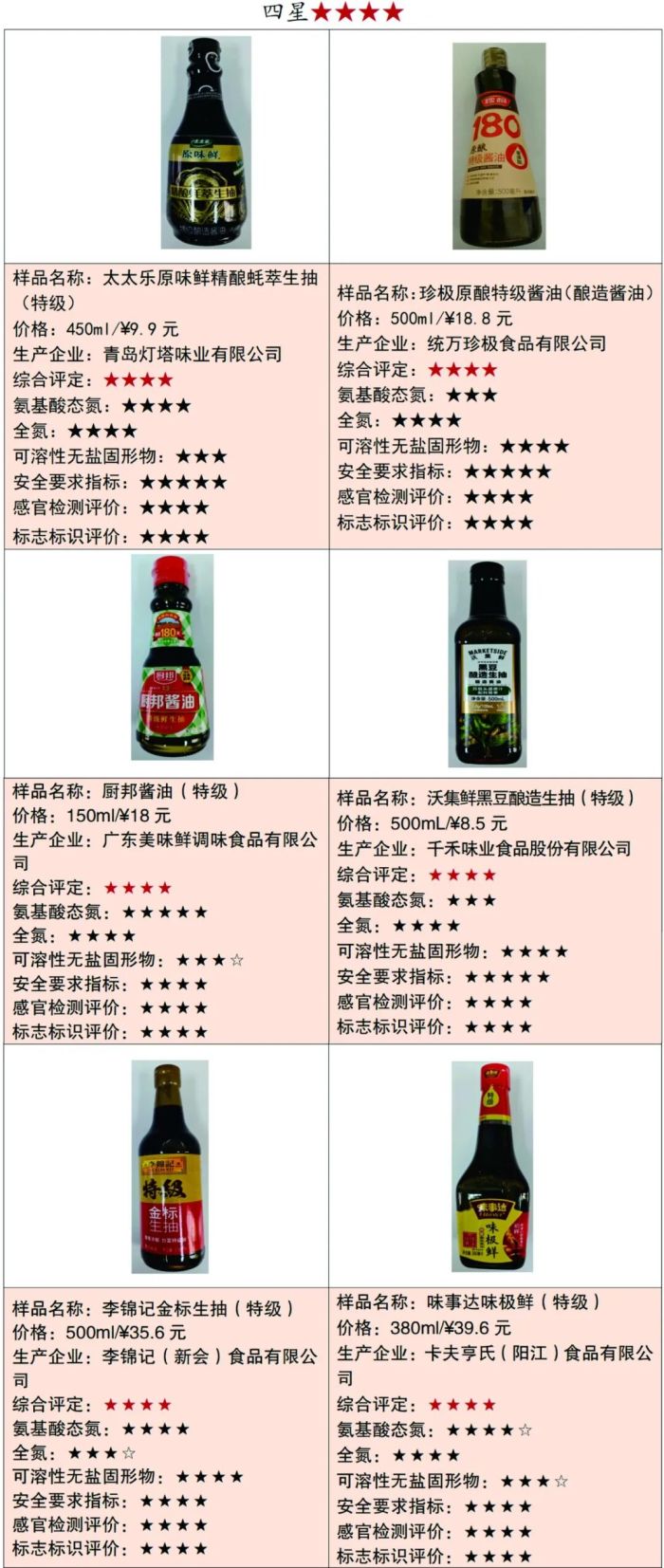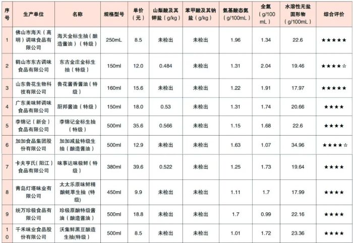 测试结果显示,10款特级酱油样品中,2款样品表现优秀获五星,2款样品表现较好获四星半,6款样品表现良好获四星测。测试结果仅对此次比较试验购买的样品负责。